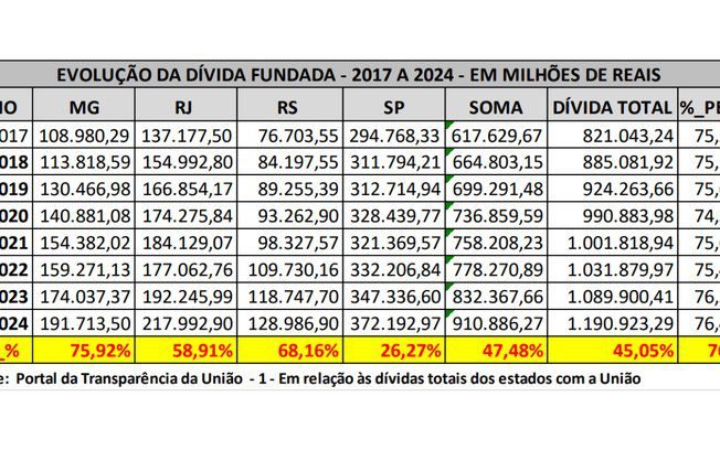 No período, a dívida de Minas Gerais saltou de R$ 108,9 bilhões para R$ 191,7 bilhões, um aumento de 75,92%. O Rio de Janeiro foi de R$ 137,1 bilhões para R$ 217,9 bilhões (alta de 58,91%) e o Rio Grande do Sul passou de R$ 76,7 bilhões para R$ 128,9 bilhões (crescimento de 68,16%). São Paulo teve aumento de 26,27%, saindo de R$ 294 bilhões para R$ 372,2 bilhões.