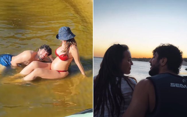 Grávida de Zuza, sua primeira filha, a influenciadora aparece usando um biquíni vermelho enquanto relaxa com o amado em um lago, em clima de tranquilidade e muito chamego.