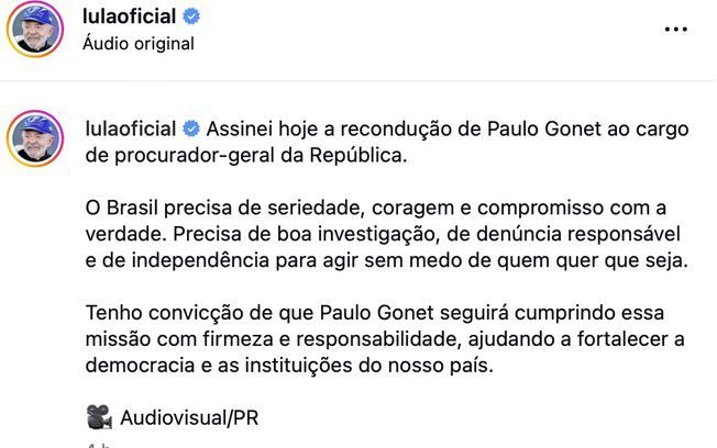 Após a cerimônia de posse, que aconteceu de forma reservada no Palácio do Planalto, Lula publicou mensagem na rede social X explicando as razões que o levaram a reconduzir Gonet.