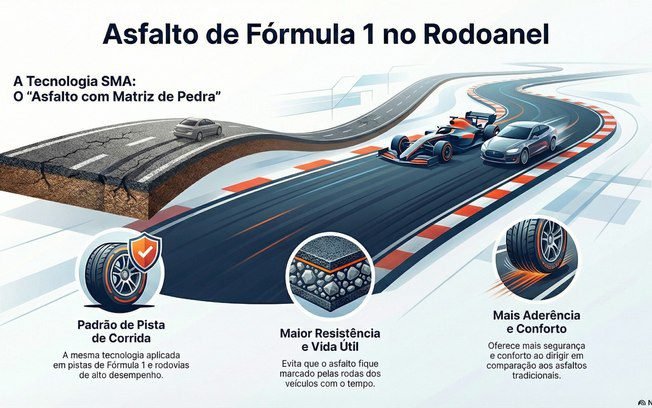 O governo de São Paulo vai entregar, na segunda-feira (22), o primeiro trecho do Rodoanel Norte. O trecho que vai conectar as rodovias Fernão Dias e a Presidente Dutra conta com uma inovação de padrão internacional: o uso do Stone Mastic Asphalt (SMA), a mesma tecnologia usada em pistas de Fórmula 1 e em rodovias de alto desempenho.