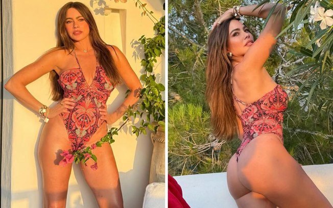 A atriz Sofia Vergara chamou atenção ao publicar fotos e vídeos nas redes sociais durante férias em Ibiza, na Espanha, nesta terça-feira (8). A atriz colombiana apareceu usando um maiô estampado cavado, em tom rosa, com decote profundo e modelo fio-dental, enquanto aproveitava o calor do verão europeu.