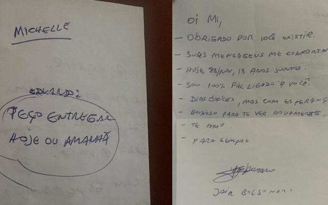 No texto, Bolsonaro se declara a Michelle, além de expressar ansiedade pelo reencontro. “Oi, mi. Obrigado por você existir. Suas mensagens me confortam. Hoje 28/nov, 18 anos juntos. Sou 100% fiel ligado à você. Dias difíceis, mas com esperança. Ansioso para te ver novamente. Te amo. Para sempre”, escreveu o ex-presidente.