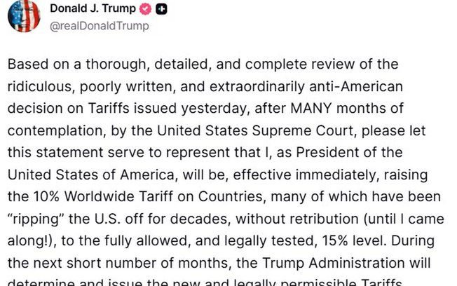 Na publicação, o republicano afirmou que irá, “com efeito imediato, elevar a tarifa mundial de 10% sobre países, muitos dos quais vêm explorando os EUA há décadas, sem retaliação (até a minha chegada!), para o nível totalmente permitido e legalmente testado de 15%.”
