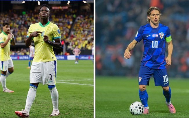 Vinicius Junior e Modric em ação por Brasil e Croácia, respectivamente Rafael Ribeiro/CBF e Reprodução X/@HNS_CFF