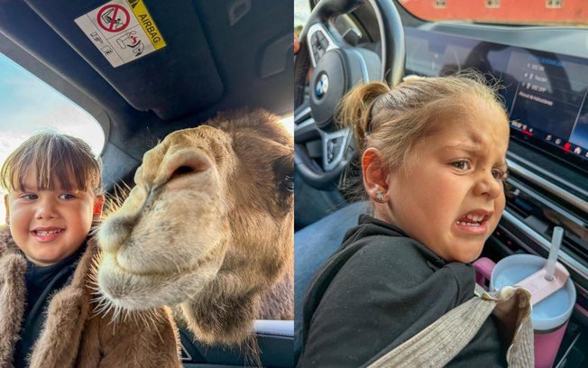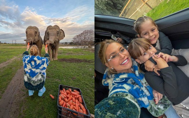 Durante um momento, os três saíram do carro e tiraram foto com os elefantes. Na legenda da publicação, a influenciadora afirmou que precisou de 10 minutos de silêncio após ficar com as crianças dentro do carro.