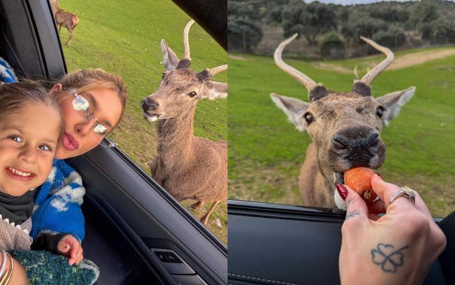 Durante o passeio, ela deu comida para os animais e incentivou os filhos a fazerem o mesmo. As crianças alimentaram os animais pela janela do carro e se divertiram com o passeio.