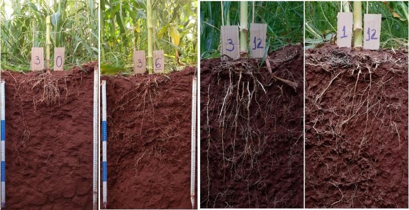O efeito foi atribuído ao maior desenvolvimento radicular em profundidade, o que permitiu às plantas acessar água e nutrientes mesmo em períodos de déficit hídrico. Nas fotos da lavoura de milho (acima) é possível verificar a diferença no desenvolvimento das plantas, com dose de 3 t/ha de calcário (primeira foto de milho) e com 12 t/ha de calcário (segunda foto de milho).