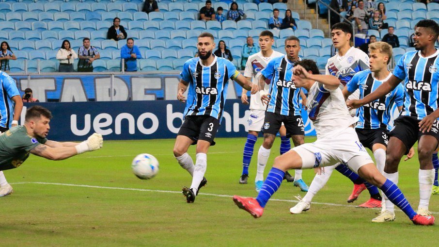O Grêmio começou mostrando atitude e estratégia inteligente, com os avanços dos laterais — notadamente Lucas Esteves pela esquerda — e com Braithwaite um pouco mais recuado. Aos seis minutos, fez um belo gol. Braithwaite foi bloqueado, mas a sobra ficou com o lateral-direito João Pedro, que mandou de esquerda, por cobertura, pegando o goleiro Petroli adiantado. Uma pintura.