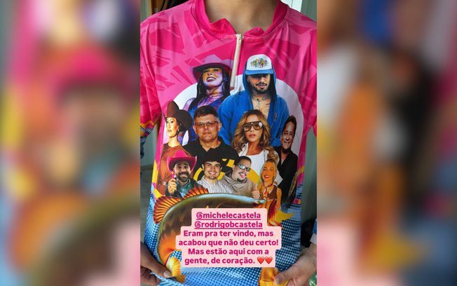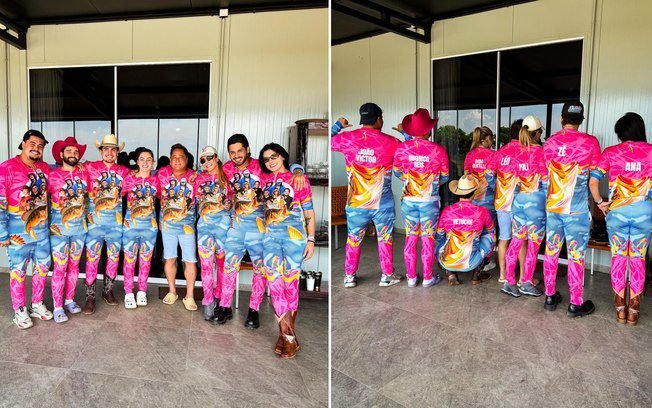 No segundo dia de pescaria, o casal chamou atenção ao surgir com camisetas personalizadas, estampando os rostos dos participantes da viagem, entre eles Leonardo, Poliana Rocha e os pais da cantora, Michele e Rodrigo.