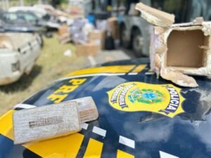 Na manhã da quarta-feira (09), a Polícia Rodoviária Federal (PRF) apreendeu aproximadamente 2 kg de crack, 48 celulares sem nota fiscal e 43 unidades de cigarros eletrônicos durante fiscalização a